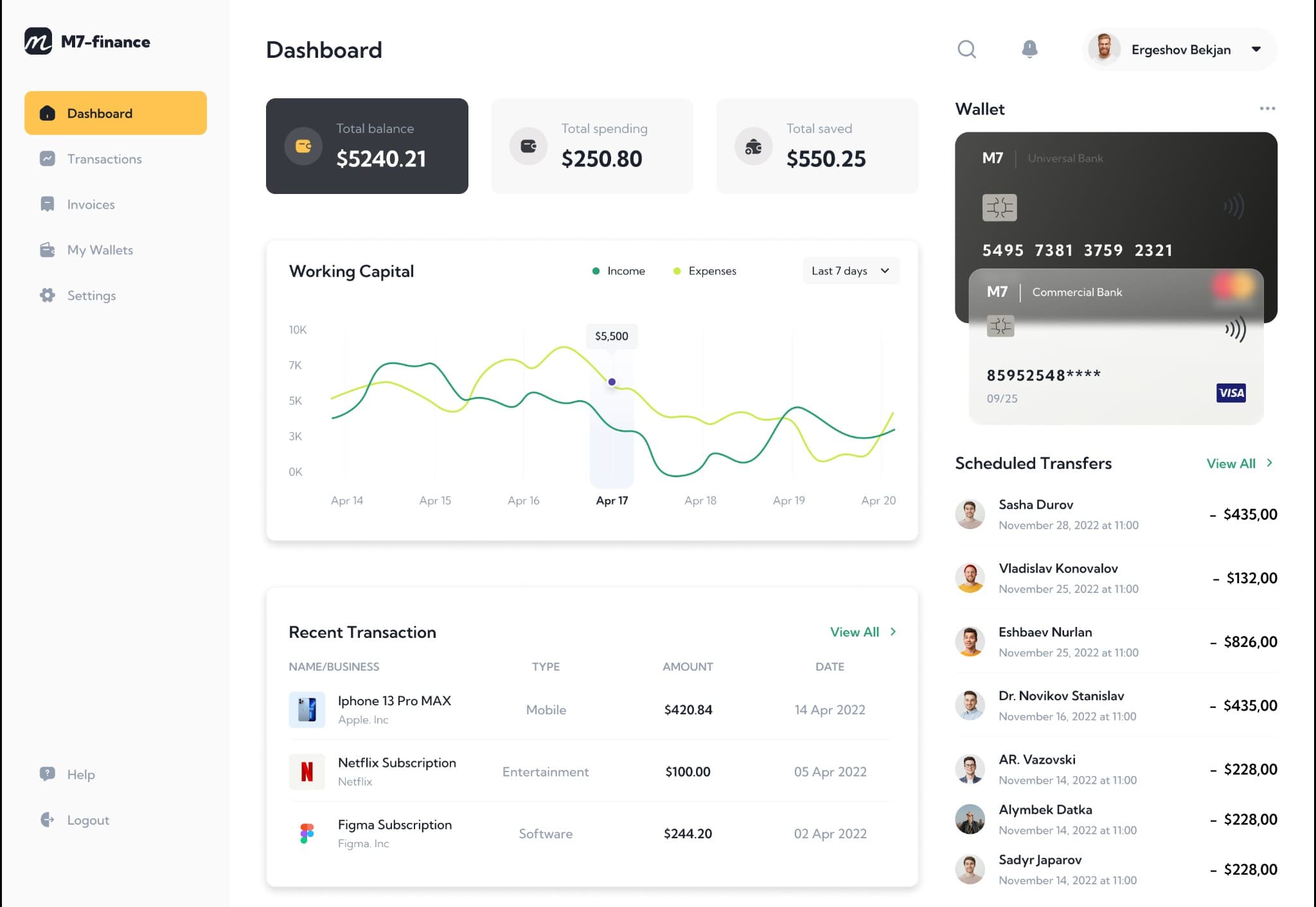Dashboard — total balance/spending/savings cards, working capital chart (Income vs Expenses), recent transactions, wallet cards, scheduled transfers
