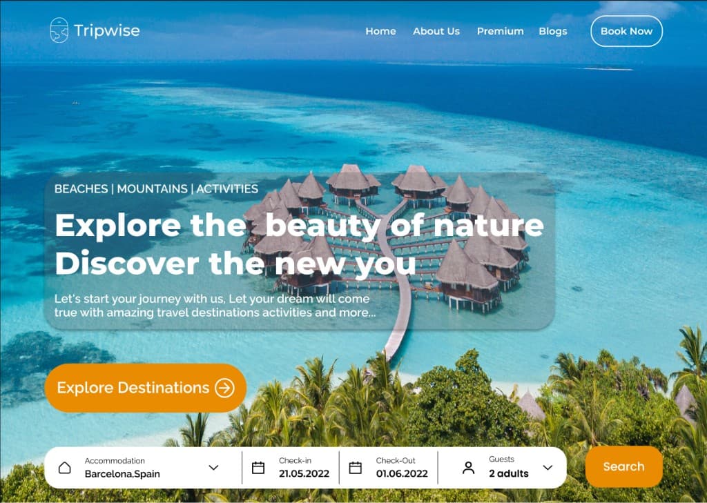 Hero — full‑viewport Maldives aerial photo, glassmorphism text panel ('Explore the beauty of nature'), category chips, 'Explore Destinations' CTA, 4‑field search bar (Barcelona Spain, 21.05.2022 – 01.06.2022, 2 adults)